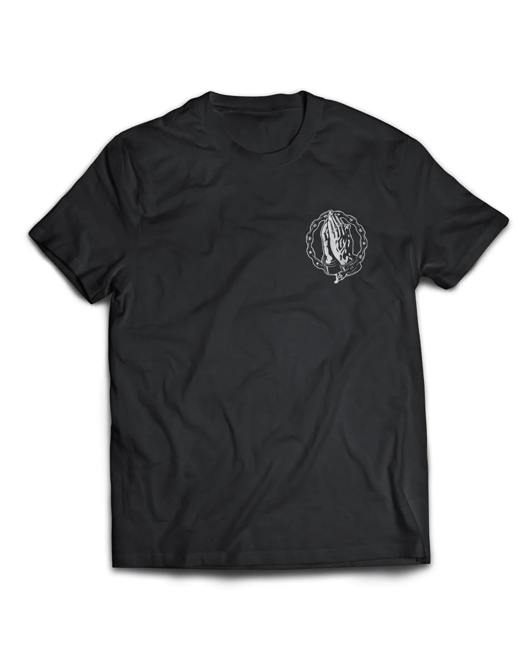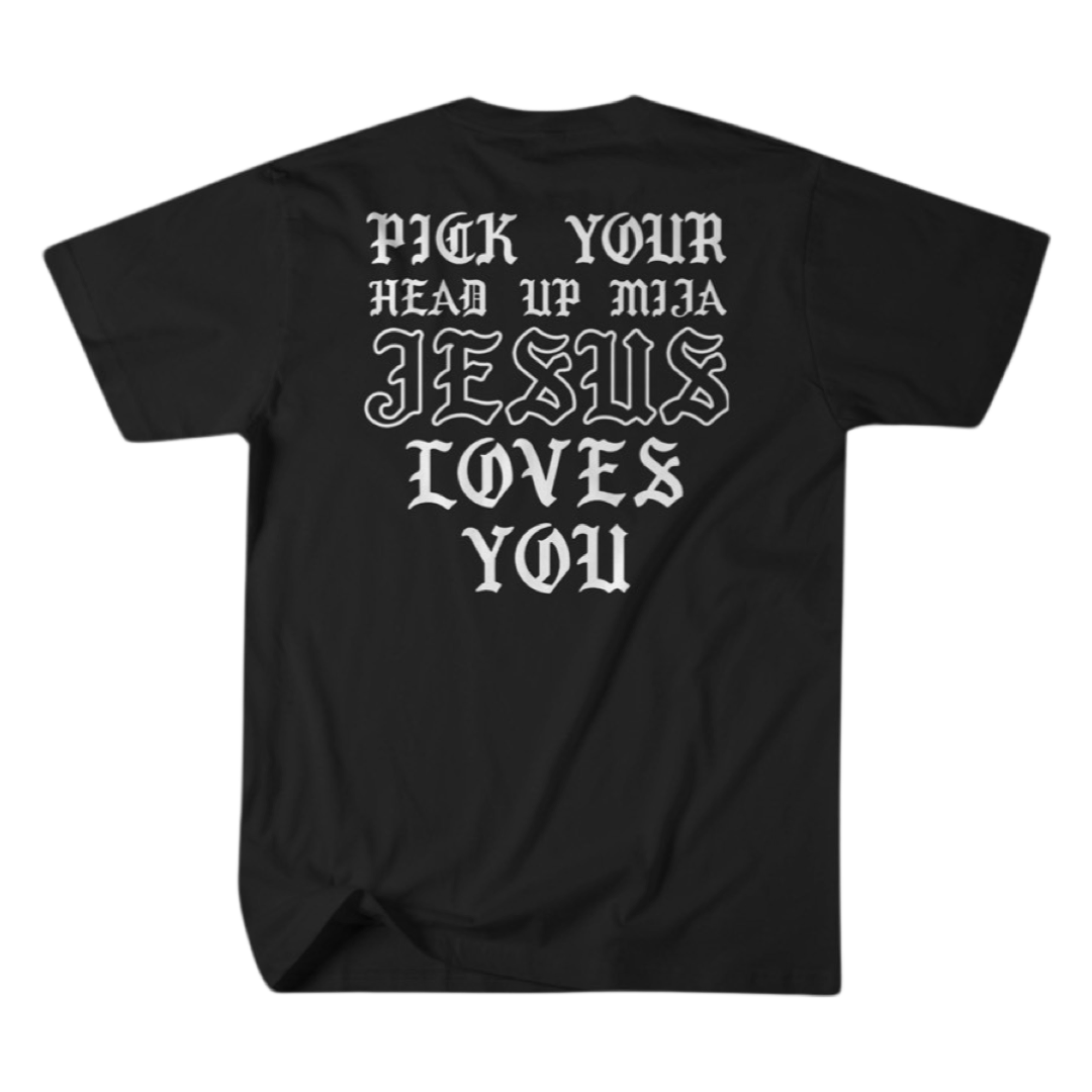 Front of shirt pocket logo. Back of shirt, pick your head mija Jesus love you.